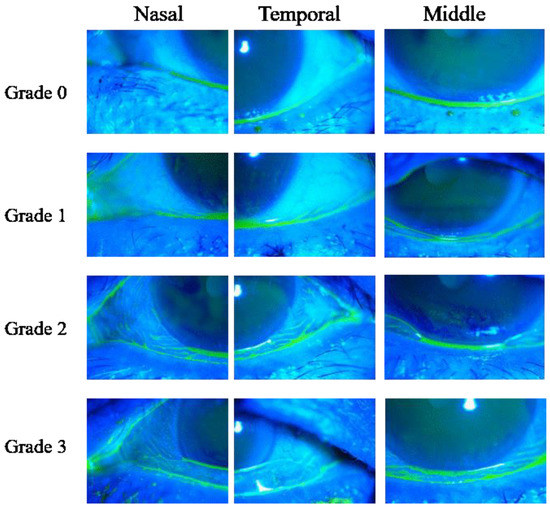 2단계 (Grade 2): 두 개 이상의 결막 주름이 있으나, 눈물띠(tear meniscus) 높이를 넘지 않음