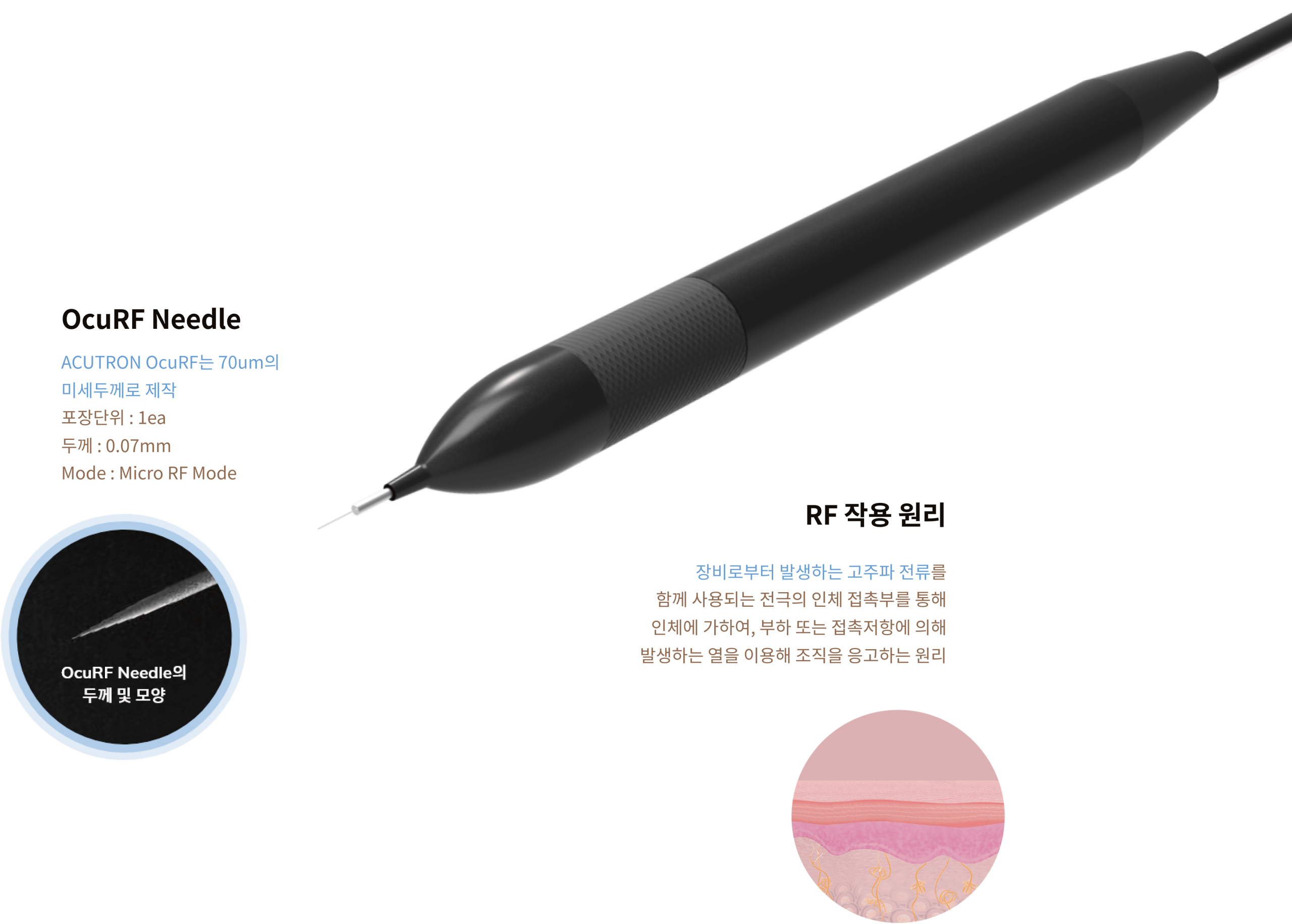 70μm 초미세 OcuRF Needle과 저출력 펄스를 사용해 섬세하고 정확한 시술이 가능하며, 결막이완증, 눈물점폐쇄술, 첩모난생증 등 성형안과·건성안 치료에 널리 사용됩니다.